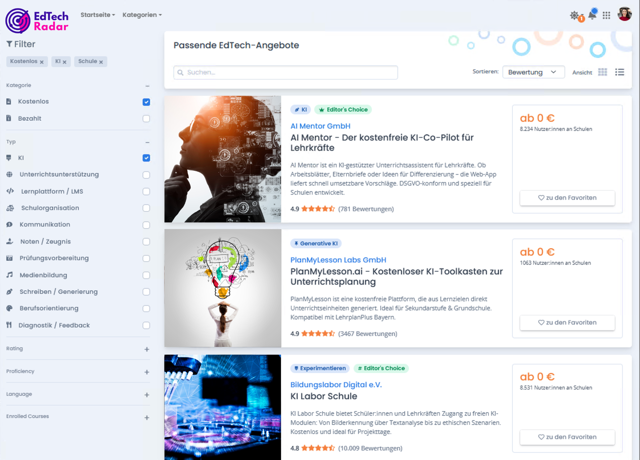 Alle EdTech-Angebote sind übersichtlich aufbereitet: Sie sehen auf einen Blick Funktionen, Zielgruppen, Datenschutzinfos, Preise und Anwendungsbereiche. So sparen Sie Zeit und treffen fundierte Entscheidungen.